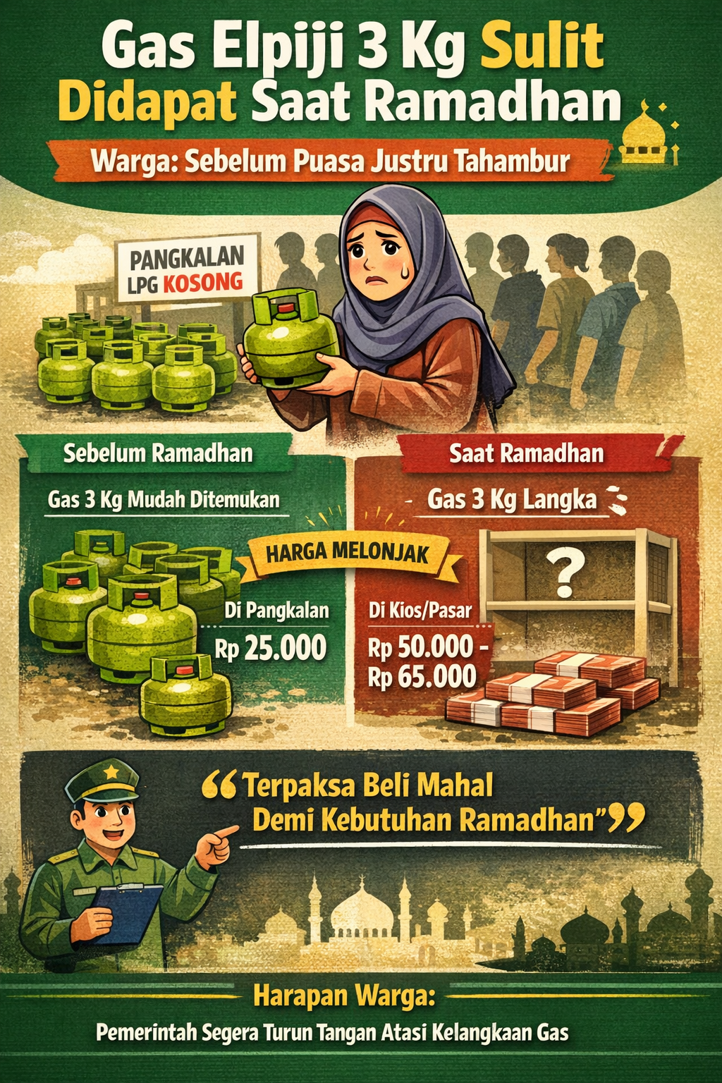 “Harga di pangkalan memang Rp25 ribu, tapi kami jarang dapat. Justru yang tersedia di kios atau pasar harganya jauh lebih mahal. Mau tidak mau tetap dibeli karena kebutuhan di bulan Ramadhan,” tambah warga.