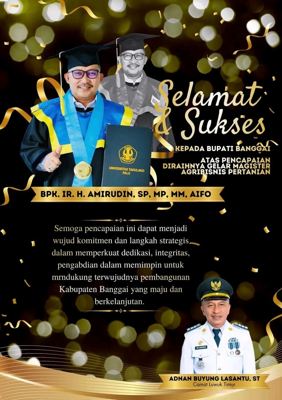 BANGGAIPOST LUKTIM – Camat Luwuk Timur, Adnan B. Lasantu, menyampaikan ucapan selamat dan apresiasi kepada Bupati Banggai, Amirudin, atas keberhasilannya meraih gelar Magister Agribisnis Pertanian.