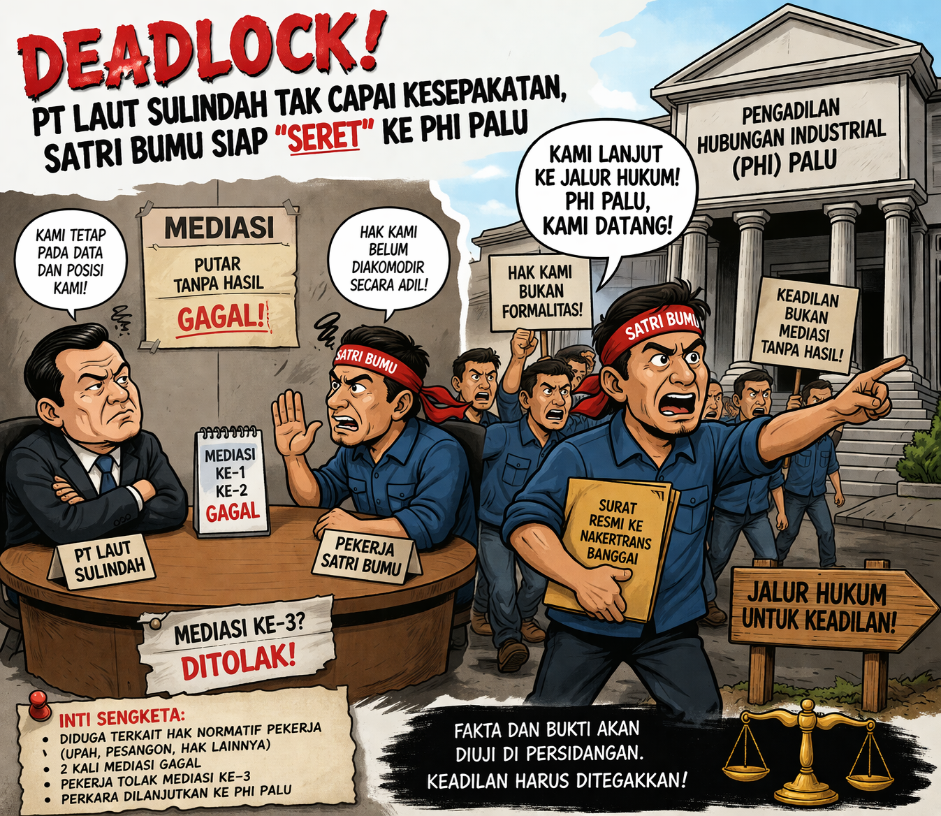 BANGGAIPOST LUWUK – Perselisihan hubungan industrial antara pekerja Satri Bumu dan manajemen PT Laut Sulindah Luwuk, Kabupaten Banggai, kini memasuki fase krusial. Setelah dua kali mediasi berakhir tanpa kesepakatan, sengketa tersebut dipastikan akan berlanjut ke Pengadilan Hubungan Industrial (PHI) Palu.