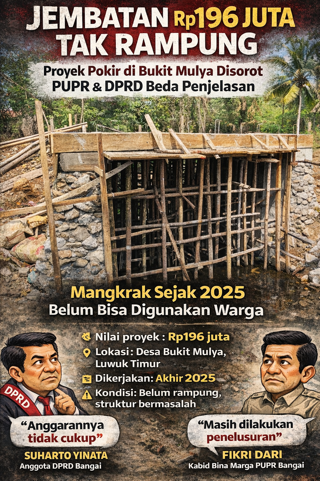Diketahui, proyek jembatan tersebut merupakan usulan Pokir yang kemudian dikerjakan oleh pihak rekanan dengan nilai anggaran sekitar Rp196 juta. Namun hingga memasuki tahun 2026, pekerjaan tak kunjung selesai dan belum dapat dimanfaatkan oleh masyarakat.