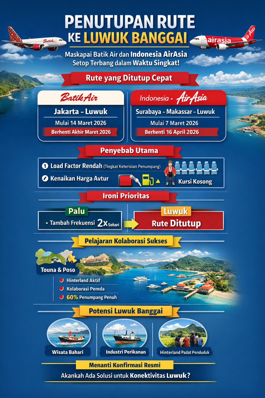 Seperti diketahui, Indonesia AirAsia sempat menambah frekuensi penerbangan Makassar–Palu menjadi dua kali sehari pada Maret 2026, sebagaimana dilaporkan sejumlah media, termasuk RRI dan media lokal Sulawesi Tengah. Kondisi ini menimbulkan pertanyaan, mengapa Luwuk—yang memiliki potensi pariwisata bahari di Kepulauan Banggai serta dukungan hinterland Kabupaten Banggai–Kabupaten Tojo Una-Una—justru kehilangan akses.