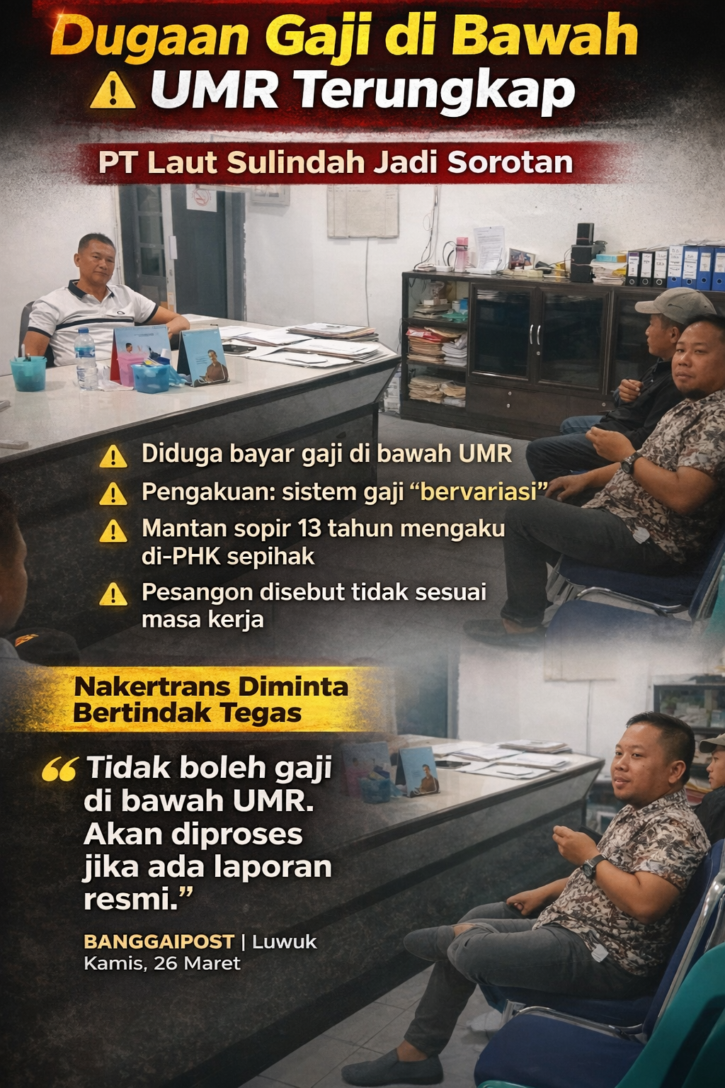 BANGGAIPOST, LUWUK – Dugaan pelanggaran hak tenaga kerja kembali mencuat di Kabupaten Banggai. PT Laut Sulindah diduga membayar gaji karyawan di bawah Upah Minimum Regional (UMR) dalam kurun waktu yang cukup lama.Temuan ini terungkap setelah media melakukan konfirmasi langsung dengan manajemen perusahaan. Dalam pernyataannya, pihak perusahaan mengakui bahwa sistem penggajian yang diterapkan bersifat bervariasi.
