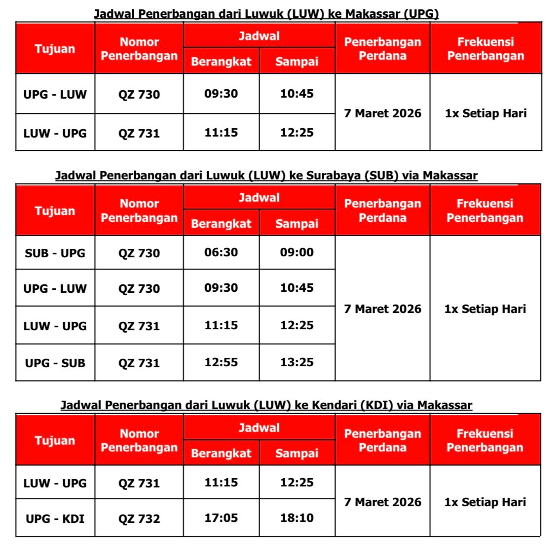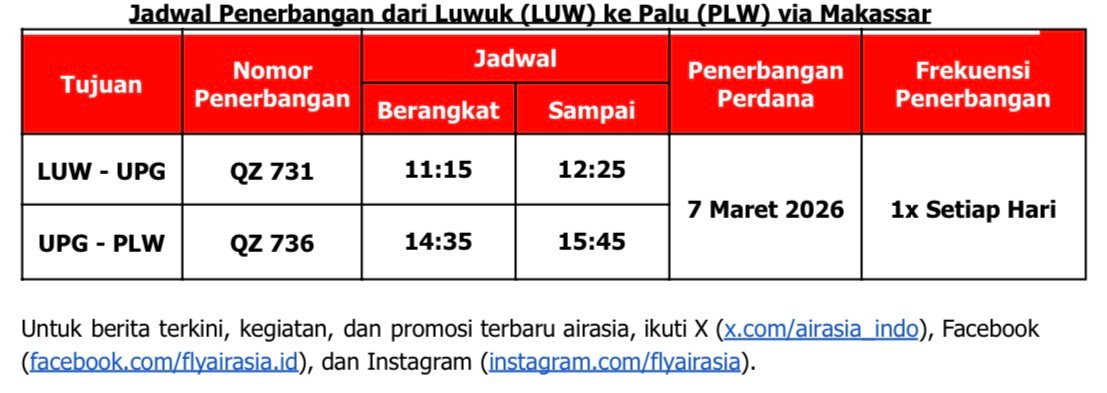 BANGGAIPOST.COM,Luwuk- Maskapai berbiaya hemat terbaik dunia versi Skytrax, Indonesia AirAsia, akan menghubungkan Luwuk dengan Surabaya, Kendari, dan Palu melalui Makassar mulai 7 Maret 2026.