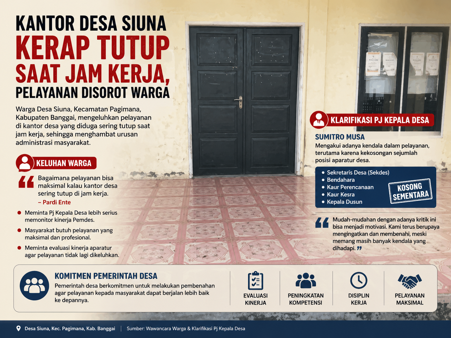 BANGGAIPOST, PAGIMANA – Pelayanan di Kantor Desa Siuna, Kecamatan Pagimana, Kabupaten Banggai, kembali menjadi sorotan warga. Pasalnya, kantor desa tersebut diduga sering tutup pada jam kerja, sehingga menghambat berbagai urusan administrasi masyarakat.