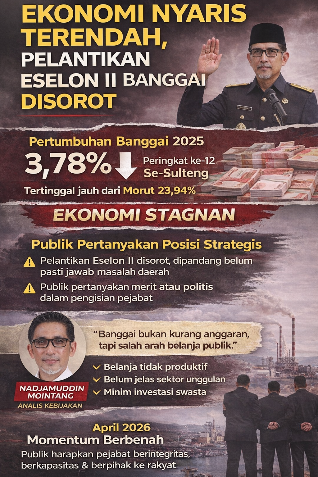 BANGGAIPOST, LUWUK — Capaian pertumbuhan ekonomi Kabupaten Banggai yang berada di posisi kedua terbawah di Sulawesi Tengah mulai memantik reaksi publik. Di tengah kondisi itu, pelantikan pejabat eselon II ikut disorot dan dinilai belum tentu menjawab persoalan utama daerah.