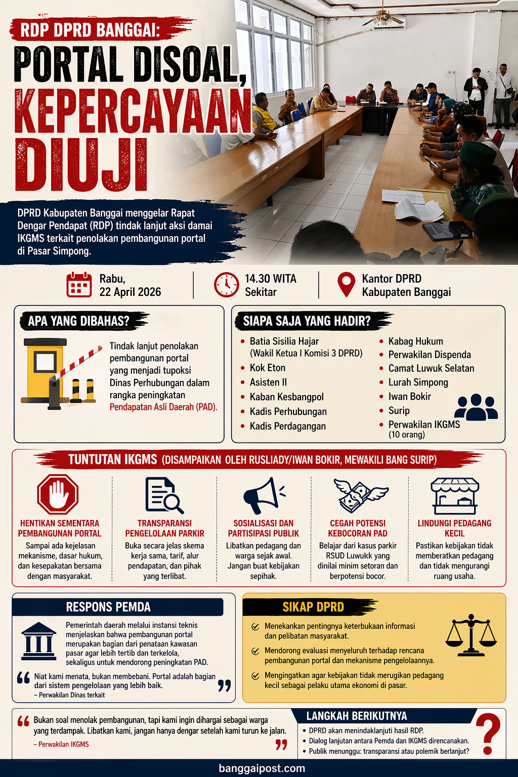 BANGGAIPOST,LUWUK – Polemik pembangunan portal di kawasan Pasar Simpong terus bergulir. Setelah aksi damai di jalan, penolakan yang digagas Ikatan Keluarga Generasi Muda Simpong (IKGMS) kini berlanjut ke ruang resmi melalui Rapat Dengar Pendapat (RDP) di DPRD Kabupaten Banggai, Rabu (22/4/2026).