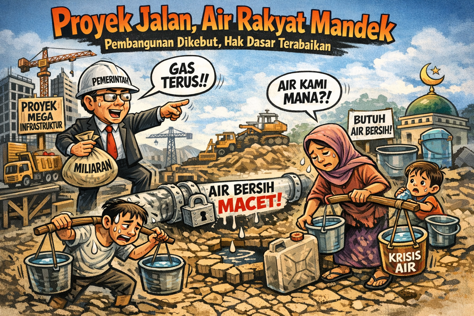 Ironisnya, di saat masyarakat kesulitan mendapatkan air bersih, pembangunan proyek-proyek besar justru terus berjalan. Jalan dibangun, infrastruktur fisik dipercepat, anggaran miliaran rupiah digelontorkan tanpa ragu. Papan proyek berdiri tegak, alat berat bekerja siang malam.