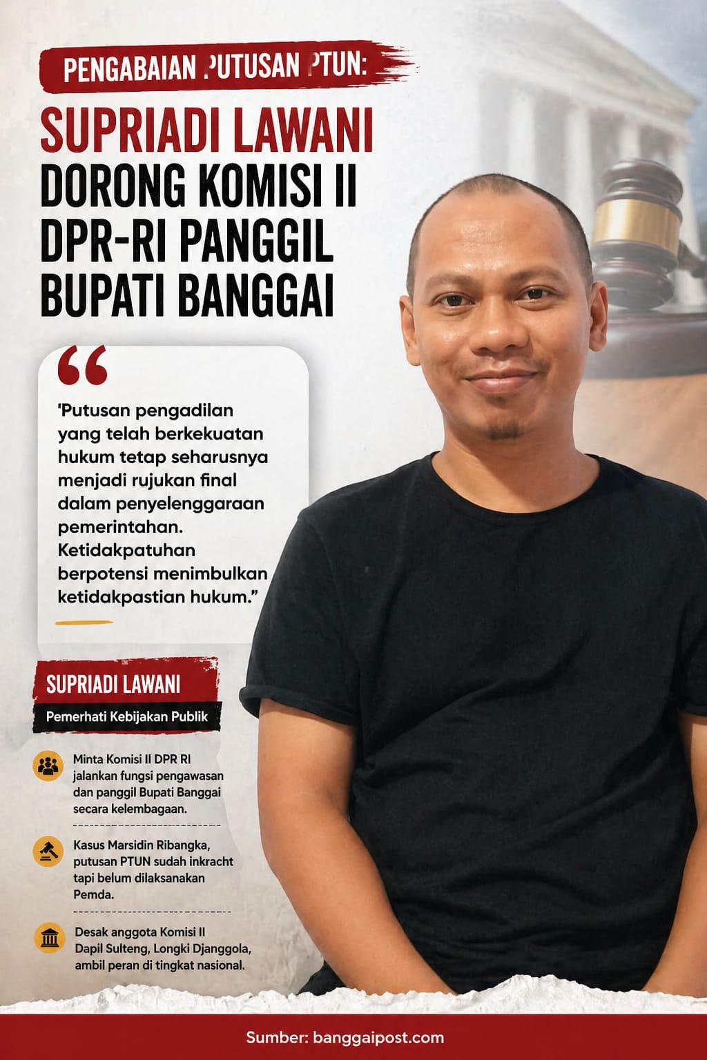 BANGGAIPOST.COM, Luwuk – Pemerhati kebijakan publik, Supriadi Lawani, meminta Komisi II DPR RI menjalankan fungsi pengawasannya dengan memanggil Bupati Banggai terkait dugaan pengabaian putusan Pengadilan Tata Usaha Negara (PTUN) yang telah berkekuatan hukum tetap.