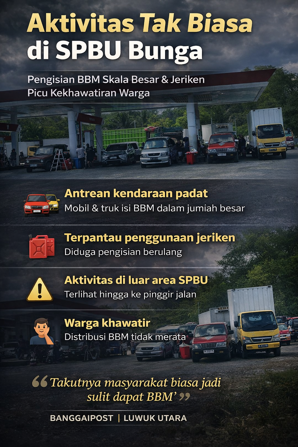SPBU yang berada di jalur strategis Trans Sulawesi tersebut memang dikenal sebagai salah satu titik pengisian utama di wilayah Luwuk Utara dan sekitarnya, sehingga kerap dipadati kendaraan.