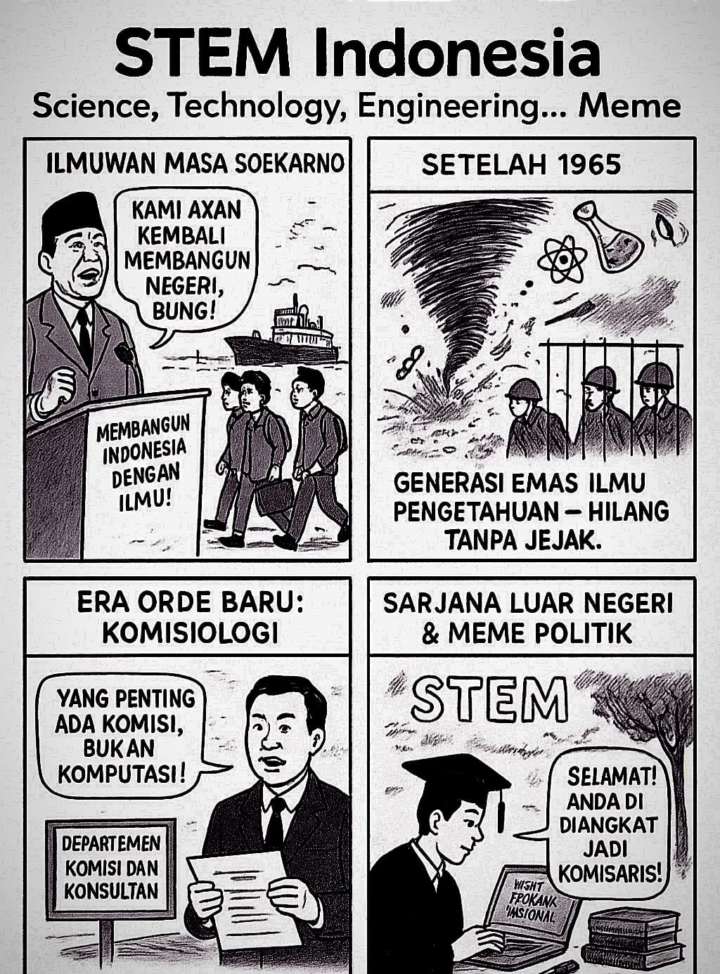 Sekarang istilah kerennya adalah STEM—Science, Technology, Engineering, and Mathematics. Katanya itu fondasi dunia modern. Dulu, pada zaman Soekarno, ribuan mahasiswa Indonesia dikirim ke Rusia, Tiongkok, Eropa Timur, bahkan Korea Utara. Tujuannya jelas: pulang, lalu bangun Indonesia.
